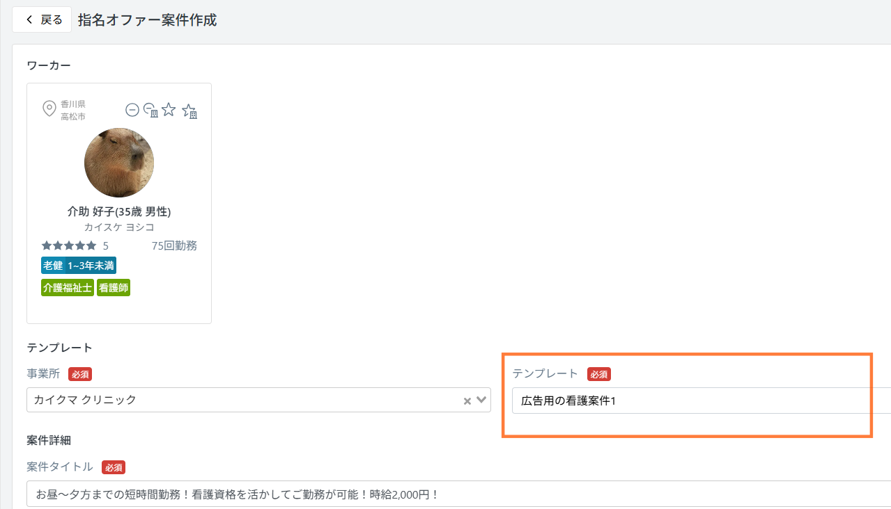 ③ 指名オファー案件作成画面でテンプレートを選択します。