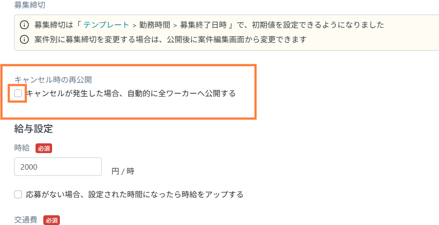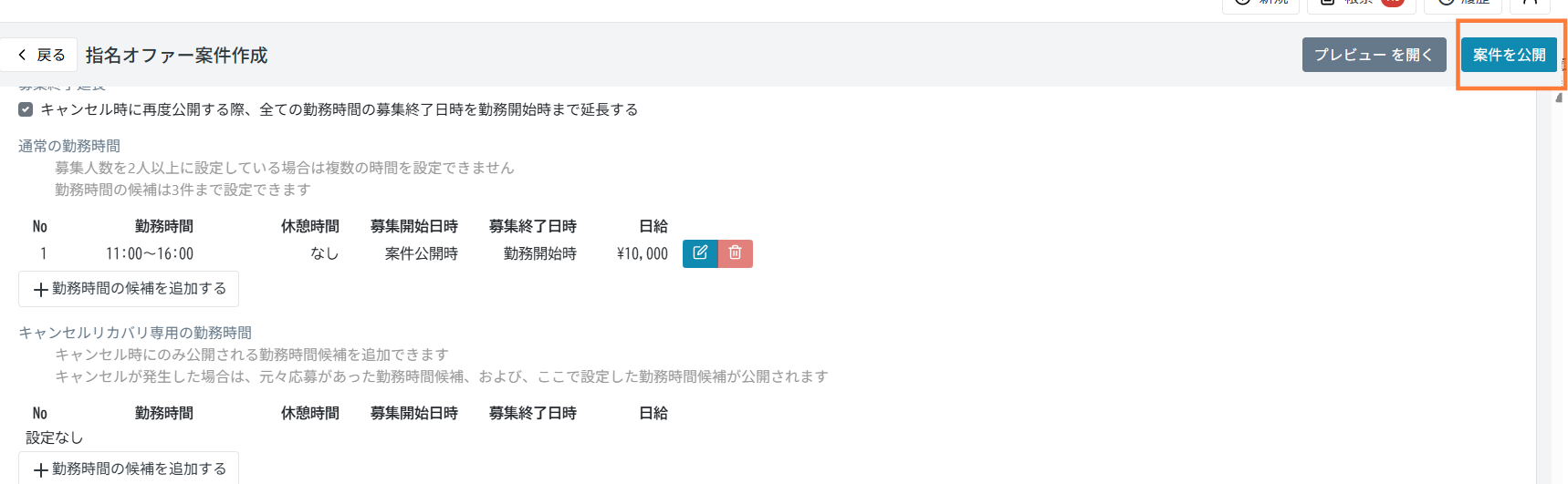 ☑をいれていただくことで、指名オファーでもキャンセルされた場合は、一般公開に切り替えることも可能です。(基本は再公開されません)