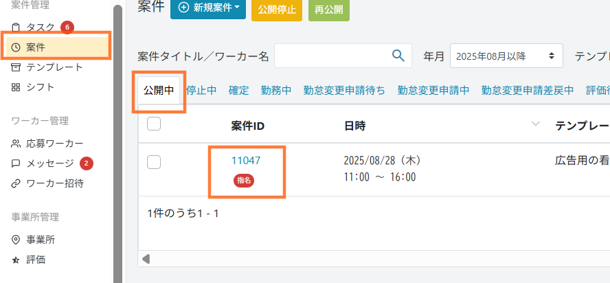 ⑥ 案件にて、公開中に指名オファーが正しく表示されていることをご確認ください。