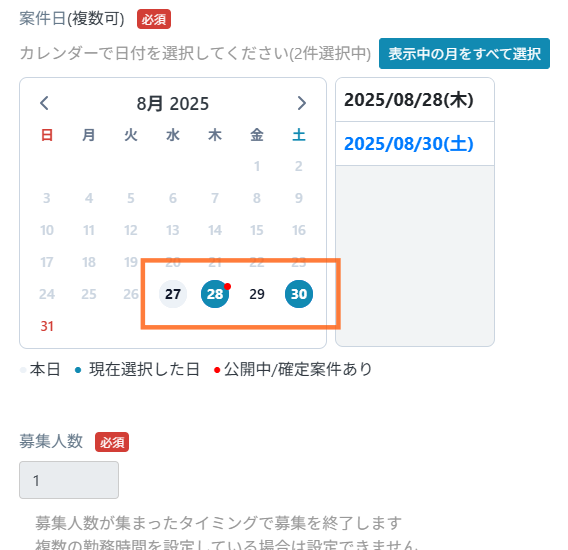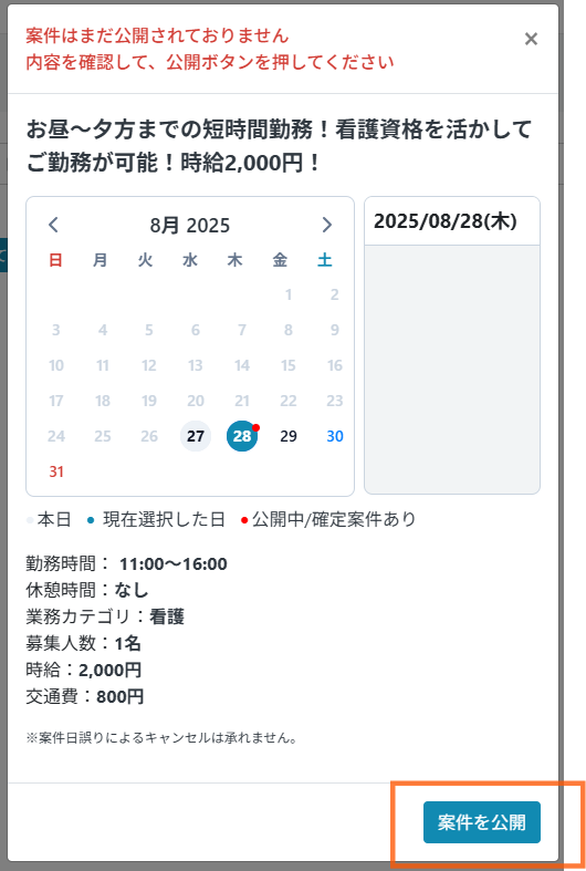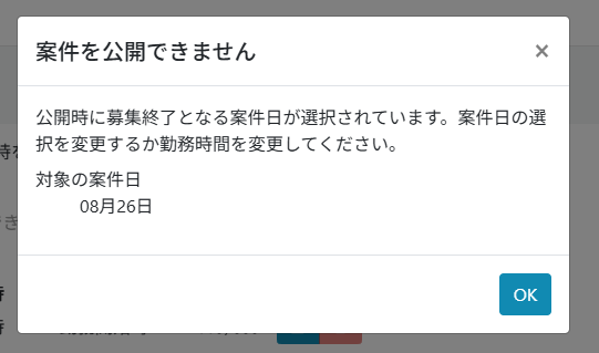 募集終了日時を設定している場合や、すでに公開時刻を過ぎた案件を公開しようとすると、以下の様なエラー設定が表示されます。案件情報をご確認ください。