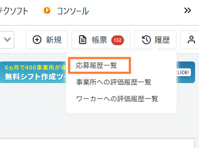 ① 右上、「履歴」を選択し、「応募履歴一覧」をクリックします